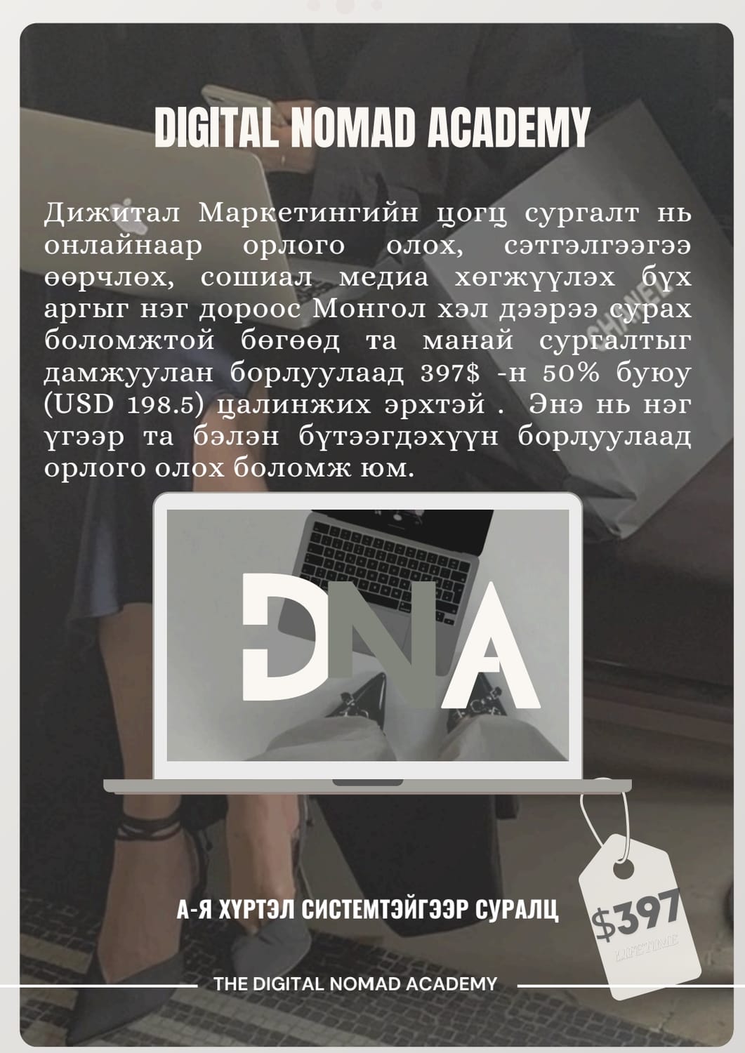 Дижитал Маркетингийн цогц сургалт нь онлайнаар орлого олох, сэтгэлгээгээ өөрчлөх, сошиал медиа хөгжүүлэх бүх аргыг нэг дороос Монгол хэл дээрээ сурах боломжтой бөгөөд та манай сургалтыг дамжуулан борлуулаад 397$ -н 50% буюу (USD 198.5) цалинжих эрхтэй . Энэ нь нэг үгээр та бэлэн бүтээгдэхүүн борлуулаад орлого олох боломж юм.